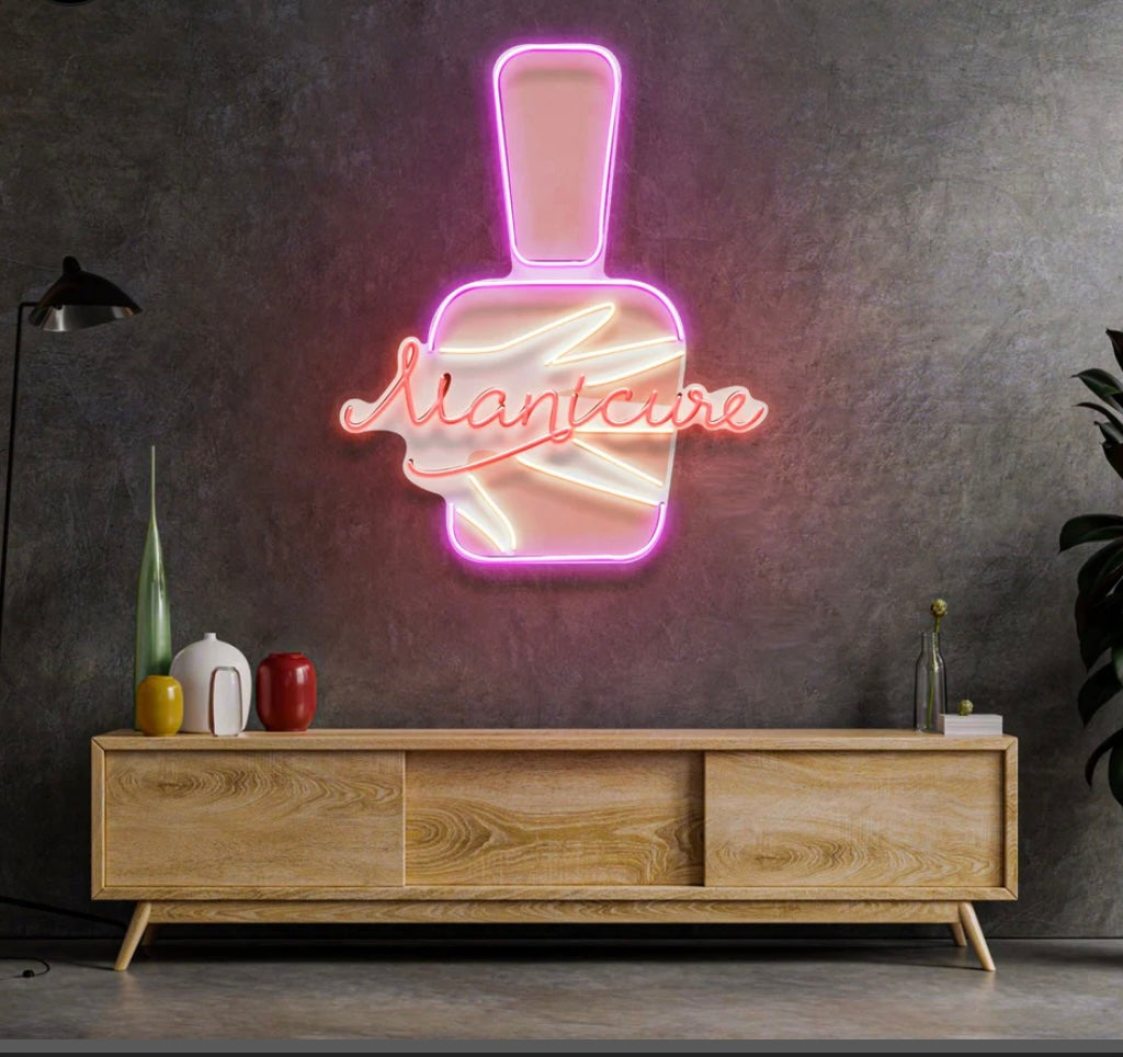 Illuminate your space with Nail Polish 2. This neon LED UV printed sign adds a bold touch to any room. Neon colors and technology evoke a retro vibe while showcasing your love for nail polish. Upgrade your decor and get creative with 100% genuine neon glass.